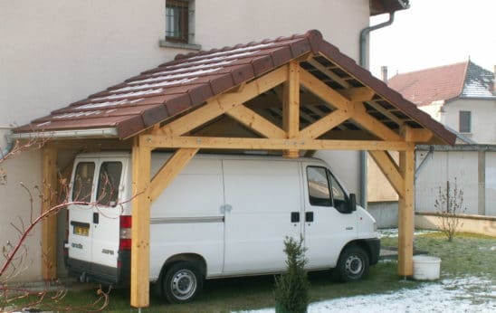 Nos auvents sont bâtis en charpente traditionnelle avec des poteaux contre collés de 14 x 14 cm à 18 x 18 cm selon la structure choisie. Le contre collé présente l’avantage de ne jamais fendre ni se déformer, contrairement aux bois bruts, assurant ainsi une stabilité exemplaire de l’ouvrage dans le temps.